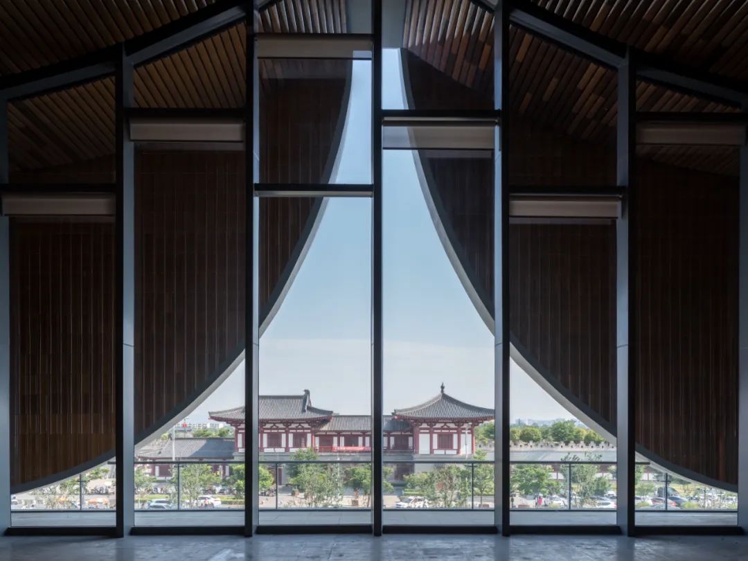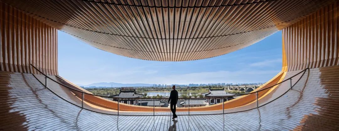 南边通透的“唐瓦当”立面面向洛河开放,西边落地玻璃幕墙对着公园开放,在博物馆里向南眺望,能看到洛河,向北能看到公园郁郁葱葱的绿化,“它像照相机的取景器一样,层层叠叠地朝向公园打开的。”