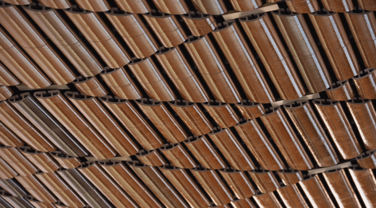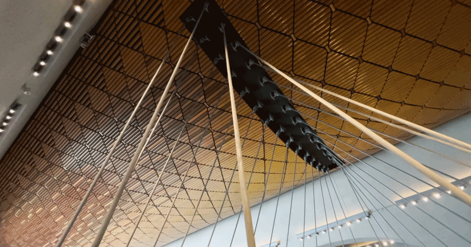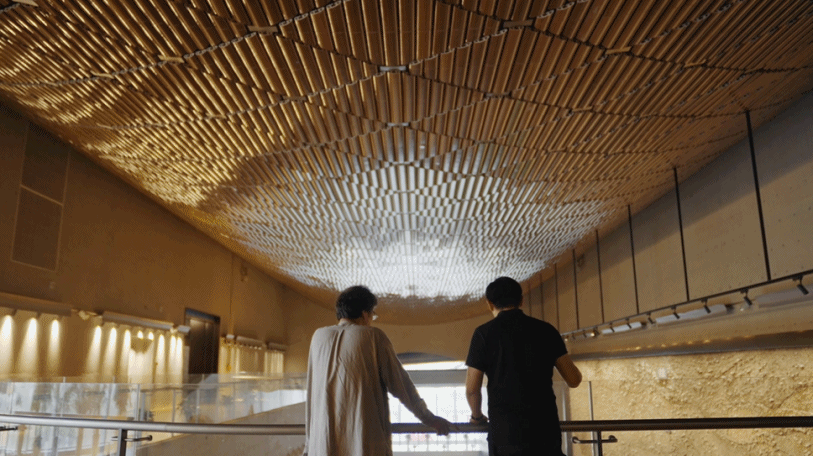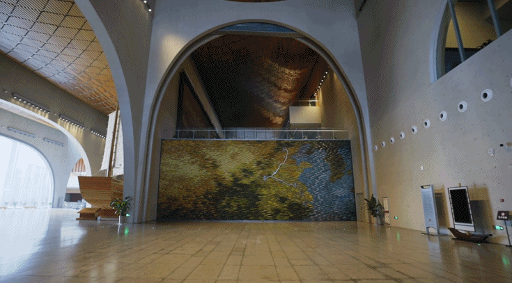 椭圆陶管拼合成上万个菱形,如云中扬帆,仰头犹如仰视流淌的大运河般壮阔美好,波光荡漾。