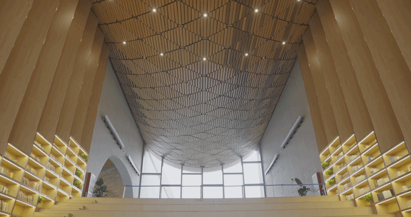 室内下垂的屋顶与外部的拱形基座恰好相背,形成“对偶”状态, “我们用这种 ‘正反拱’,来回应一种隋唐韵味的再现”,一旁的李立说道。