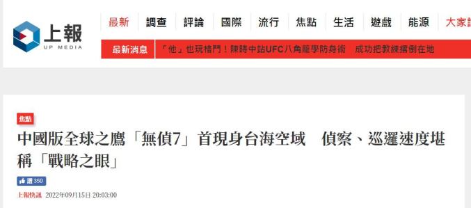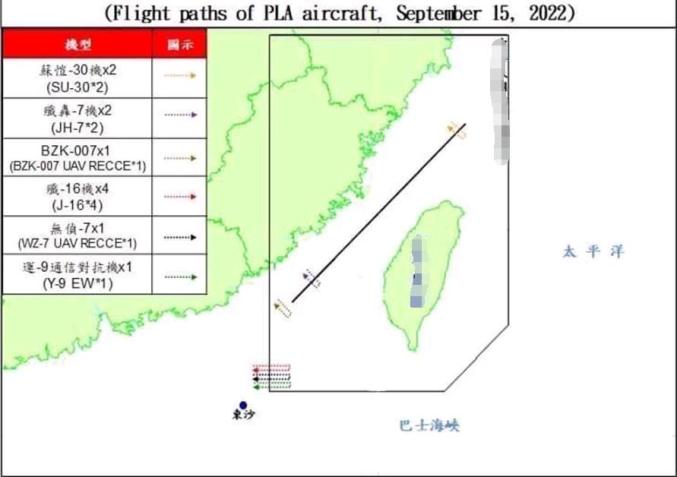 台湾“上报”称,台空军15日公布的“台海周边空域活动示意图”显示,当天有2架次苏-30战斗机、2架次歼轰-7“逾越台海中线”;1架次BZK-007无人机、4架次歼-16战斗机、1架次无侦-7无人机、1架次运-9通信对抗机“侵扰西南防空识别区”。其中最引人关注的就是类似美国RQ-4“全球鹰”战略无人侦察机的无侦-7首次出现在台湾附近空域。