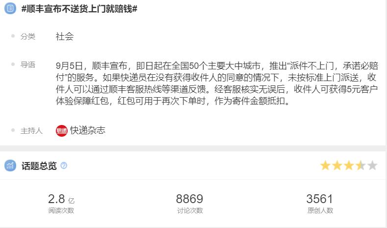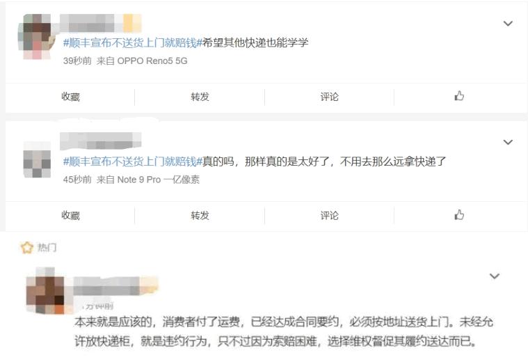 该举措发布后,迅速冲上了微博热搜。目前,“顺丰宣布不送货上门就赔钱”的话题总阅览量已突破2.8亿次。有网友表示,这本来就是应该的。消费者付了运费,已经达成合同要约,必须按地址送货上门。未经允许放快递柜,就是违约行为,只不过因为索赔困难,选择维权督促其履约送达而已。