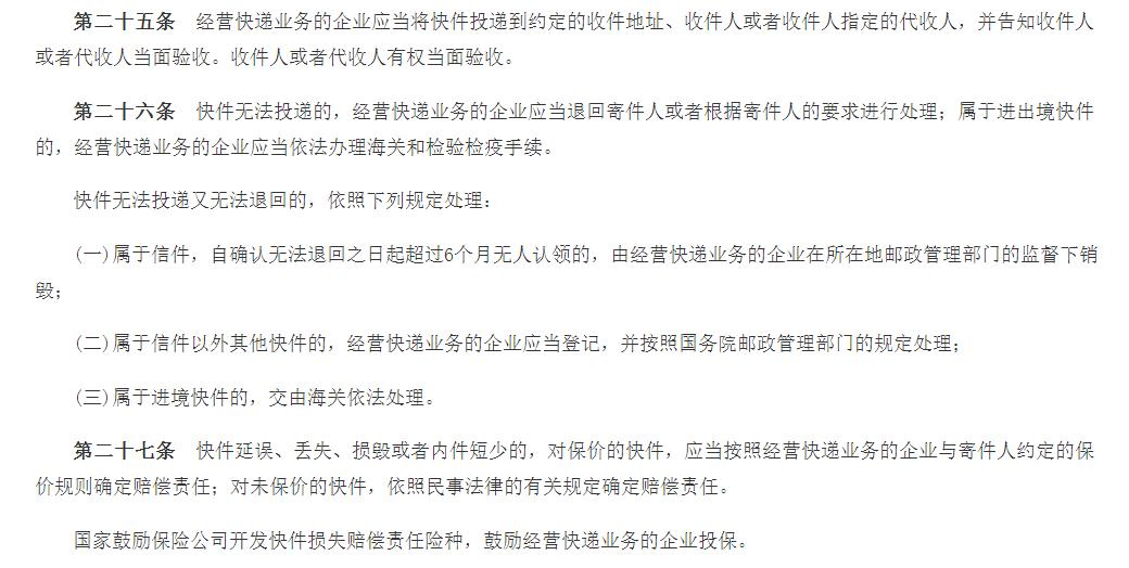 针对快递送货不上门的问题,今年1月7日,国家邮政局发布的《快递市场管理办法(修订草案)》(征求意见稿)中已经提出,经营快递业务的企业未经用户同意,不得代为确认收到快件,不得擅自将快件投递到智能快递箱、快递服务站等快递末端服务设施。若出现上述快递服务问题,将由邮政管理部门责令改正,予以通报批评,并可处3000元以上、1万元以下的罚款;情节严重的,处1万元以上3万元以下的罚款。