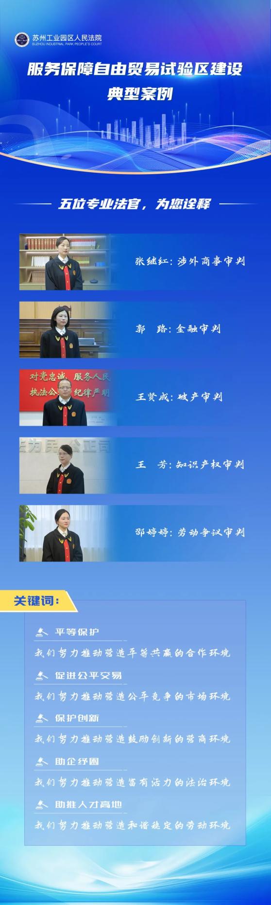 2019年9月1日中国(江苏)自由贸易试验区苏州片区正式挂牌。三年来,围绕建设一流自由贸易试验区的定位与目标,苏州工业园区人民法院直面苏州自贸片区政府职能转变、投资领域开放、贸易发展方式转变、金融领域开放创新等带来的变化与挑战,立足审判执行工作,贯彻服务大局、司法为民、公正司法理念,坚持守正创新、精准发力的准则,以更好服务推进更高水平对外开放,为自由贸易试验区的建设提供优质高效的司法保障。本次发布的苏州工业园区人民法院服务保障自由贸易试验区建设典型案例,系以司法不断优化法治化营商环境、服务保障自贸区发展的集中体现,也体现了苏州工业园区人民法院三年多来在助推苏州自贸片区发展方面的丰硕成果。