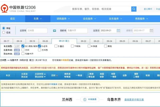 9月17日上午,查询12306网站发现,目前兰州西发往乌鲁木齐的高铁车票已停售。