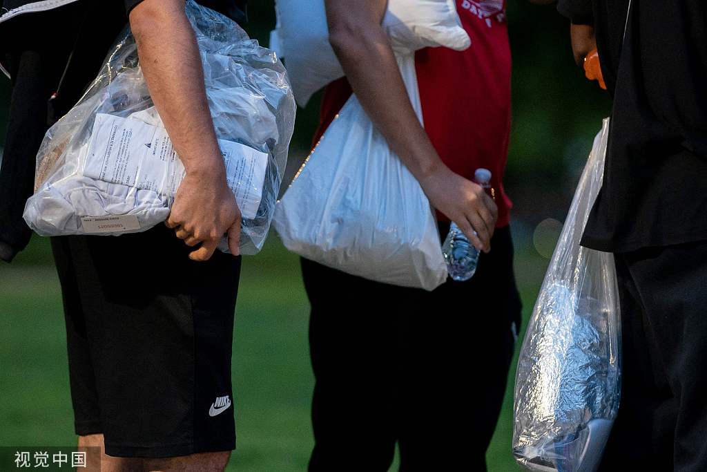当地时间2022年8月11日,美国得克萨斯州,一名移民登上巴士,他们把自己的物品装在塑料袋里,之后被送到了华盛顿特区的美国国会大厦。视觉中国 资料图