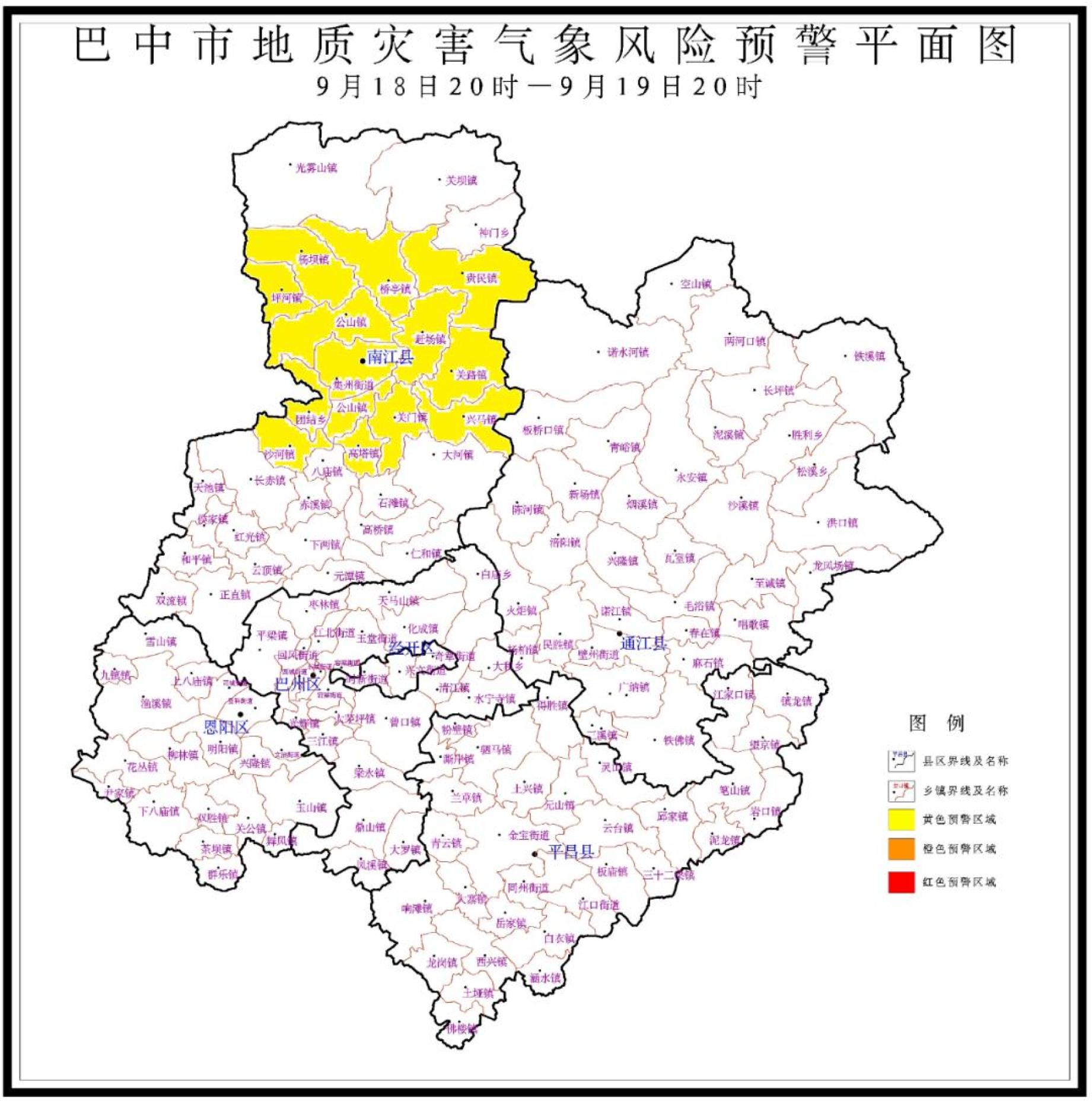 巴中市气象台2022年09月19日09时20分发布暴雨橙色预警信号:登科街道、文治街道、司城街道、明阳镇、九镇、尹家镇、群乐镇、双胜镇、关公镇、兴隆镇、上八庙镇、雪山镇、渔溪镇、下八庙镇、柳林镇、花丛镇、茶坝镇、玉山镇等乡镇(街道)3小时降雨量将达50毫米以上或者已达50毫米以上且降雨(20毫米/小时以上)可能持续。请注意防范强降雨天气带来的危害。巴州区气象台2022年09月19日10时29分更新暴雨黄色预警信号为暴雨橙色预警信号:目前我区平梁福星站3小时降雨已达50mm,预计我区梁永、三江、曾口、大茅坪、光辉、平梁、水宁寺、清江、大和、化成、枣林、白庙、天马山等乡镇及城区(回风、东城、西城、江北、宕梁、玉堂街道办事处)3小时降雨量将达50毫米以上或者已达50毫米以上且降雨(20毫米/小时以上)可能持续。过程中可能伴有雷电、阵性大风等强对流天气,请注意加强防范。