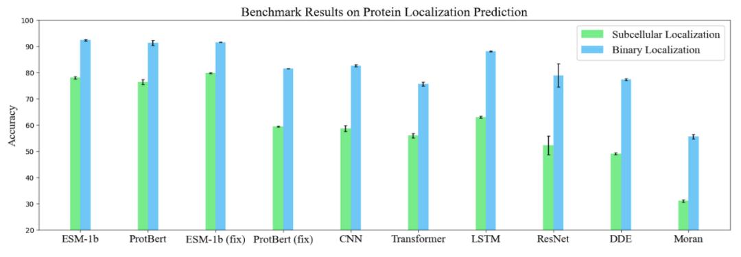 在 TorchProtein 平台上,研发团队评测了各蛋白质序列机器学习模型在各基准任务上性能,在蛋白质细胞位置预测基准上的结果如下。详细基准测试结果见 PEER Benchmark 论文(https://arxiv.org/abs/2206.02096)。