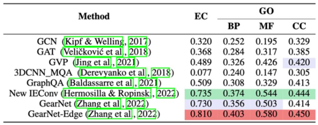 TorchProtein 团队在 EC 和 GO 两个蛋白质功能预测基准上评测了各种蛋白质结构编码模型的性能,结果如下。实现和评测细节见 GearNet 论文(https://arxiv.org/abs/2203.06125)。