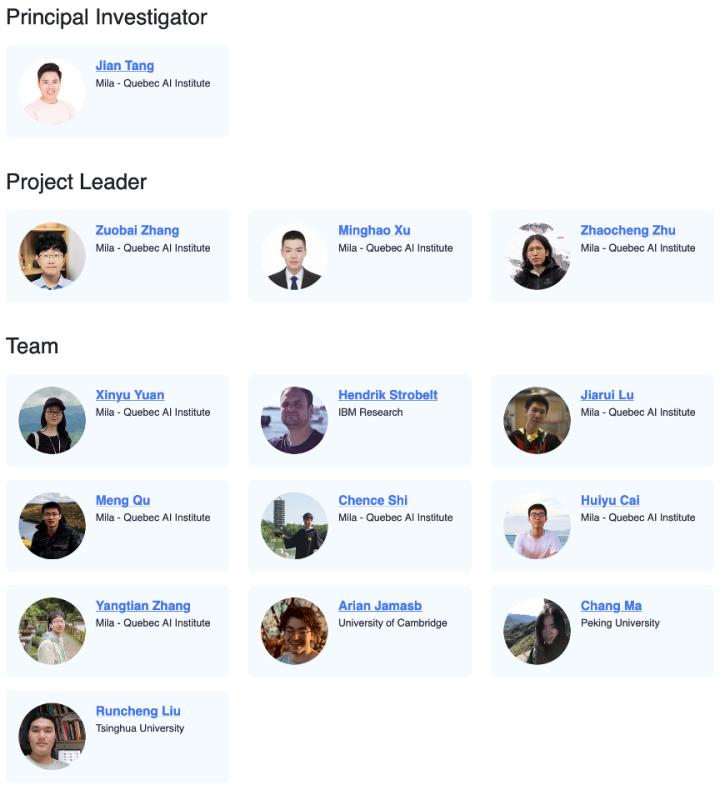 开发团队这一平台的项目负责人为加拿大蒙特利尔学习算法研究所(Mila)副教授、终身教授唐建,其研究领域包括几何深度学习、图表示学习、图神经网络、药物发现及知识图谱。唐建 2014 年毕业于北京大学信息科学技术学院并获得博士学位,2014-2016 年任职微软亚洲研究院副研究员,2016-2017 年为密歇根大学和卡内基梅隆大学的联合培养博士后,曾获 2014 年机器学习顶级会议 ICML 的最佳论文。唐建是图表示学习领域的代表性学者,他所提出的网络表示学习算法 LINE 被广泛应用,其他代表工作还包括 RotatE 等。