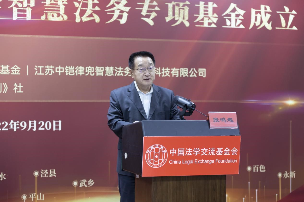 张鸣起在讲话中指出,在即将迎来党的二十大胜利召开之际,举办本次公益捐赠活动很有意义。按照《法治社会建设实施纲要》(2020-2025年)及《法治中国建设规划(2020-2025年)》的要求,应“大力推广运用远程网络等法律服务模式,促进城市优质法律服务资源向农村辐射,有效缓解法律服务专业力量不足问题”,“要充分运用大数据、云计算、人工智能等现代科技手段,全面建设‘智慧法治’”。中铠律兜公司在自身不断发展的同时,主动承担社会责任,关心公益慈善,支持革命老区和贫困地区发展,起到了很好的示范引领作用;与中国法学交流基金会发起设立智慧法务专项基金,促进智慧法治建设,很有必要,也很及时。
