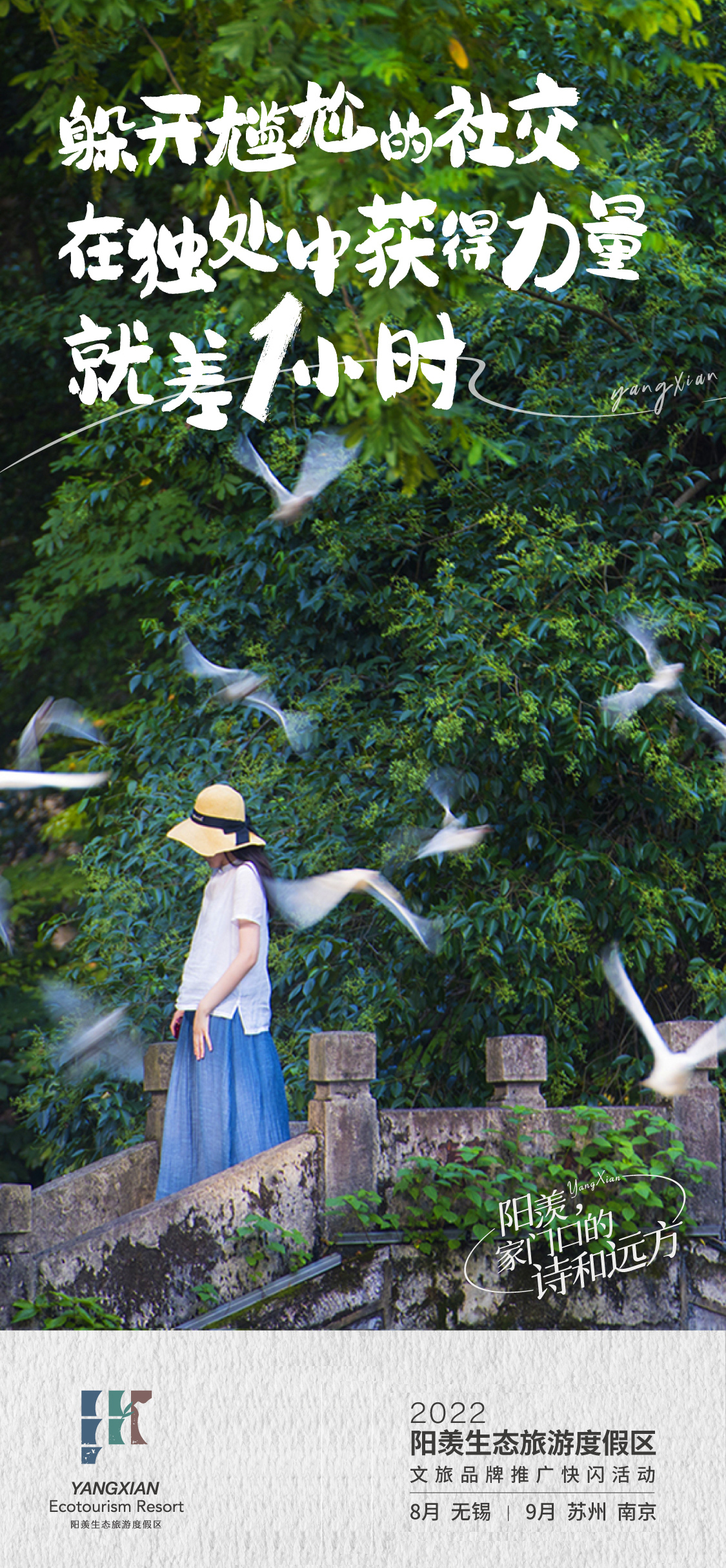 比如其中一幅海报中抓住了“社交困难,情愿独处”的社恐需求,并且为这种社会性困局提出了现实的解决方式 ——“情感能量赋予”。在阳羡,自然资源、地方民俗、美食美物不再充当主角,消费者才是;在阳羡,景点不再是景点,而是解决你情绪问题、安抚不安灵魂的良药;在阳羡,做什么不重要,重要的是在这里就好。
