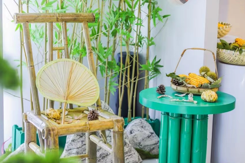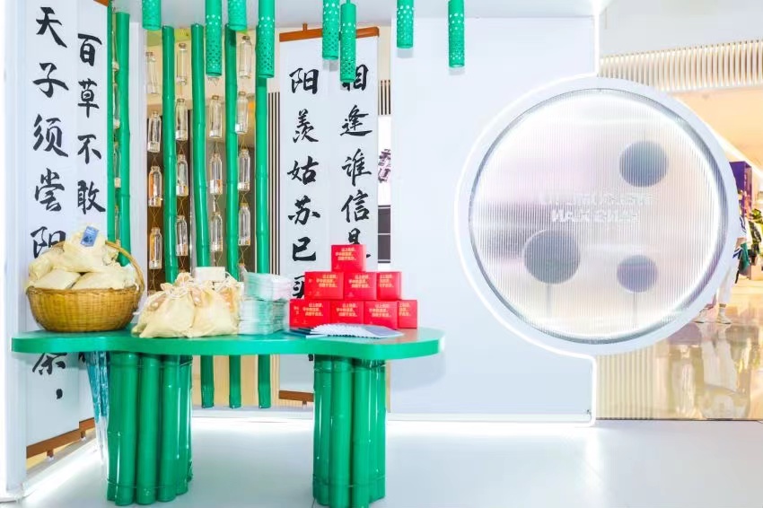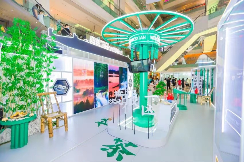在快闪店中,阳羡打出两手牌:一手当地自然风貌和特色民俗风物。以竹、山居小院、溪水、非遗作品、绿荫大道以及诗词等元素融入创作设计中,使得快闪店同时拥有了展示馆和奢侈品店的外观。同时通过旅游手帐、特制阳羡伞、乌米等文创品让消费者快速记住“阳羡”品牌;另一手则采用多媒体互动方式触达参与者,通过视觉、听觉、触觉等方式,增强参与者的体验感。