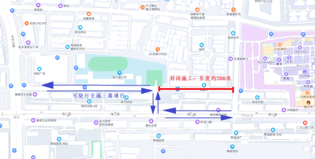 届时将封闭双向两车道(只保留人行道),车辆将无法通行,途径车辆可以绕行至海三路通行。