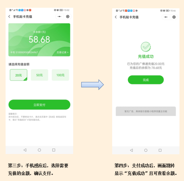 只要用带NFC功能的安卓手机,就能随时随地在广佛通小程序给卡片充值,无需去线下充值点排队。