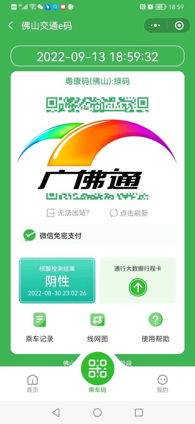 佛山交通e码全面升级,除了完成亮健康码、亮核酸结果和乘车付费三个操作以外,还可以显示行程卡的状态,真正实现一码通行佛山公交、地铁。