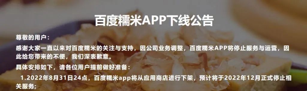 百度旗下沉寂已久的团购平台“百度糯米”日前发布下线公告。公告显示,因公司业务调整,百度糯米APP将停止服务与运营,预计将于2022年12月正式停止相关服务。