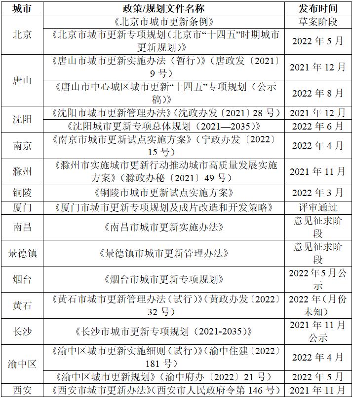 本阶段的城市更新试点工作以顶层设计为主,主要围绕地方性法规政策的制定、专项规划的编制推动城市更新工作统筹和体系化建设。本文梳理各试点城市从2021年11月至今在顶层设计方面制定和出台城市更新相关政策和规划文件的情况如下: