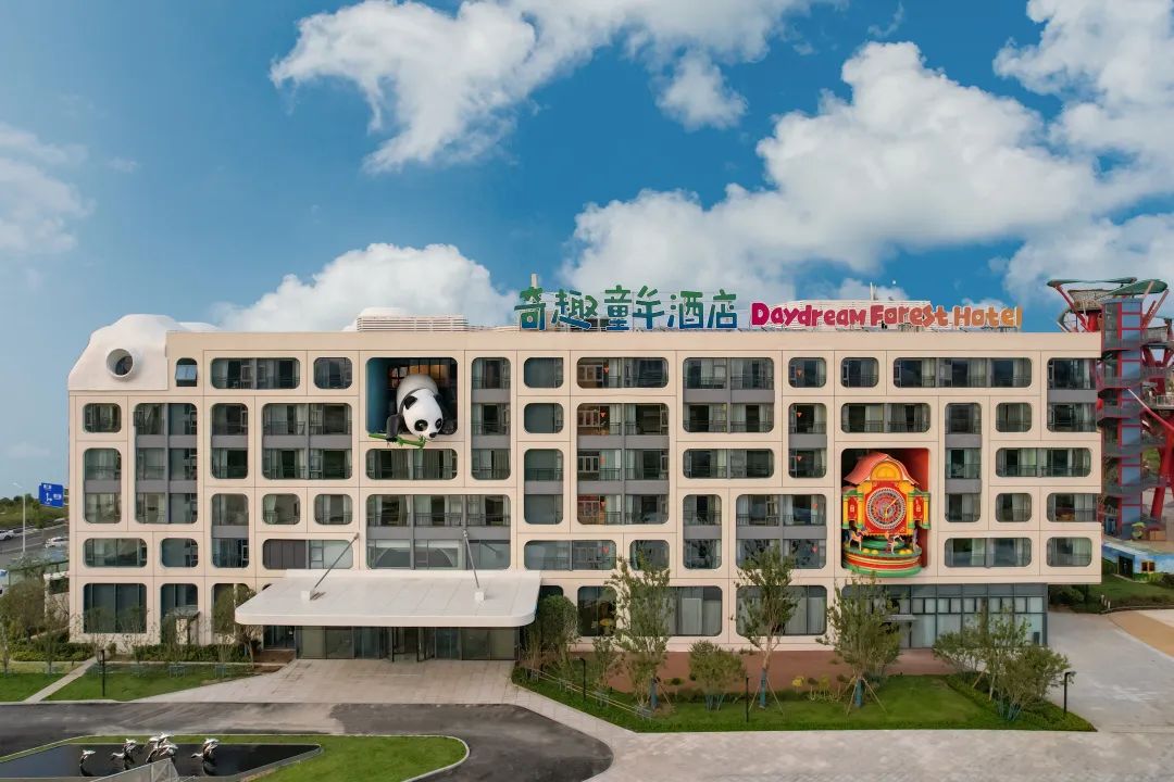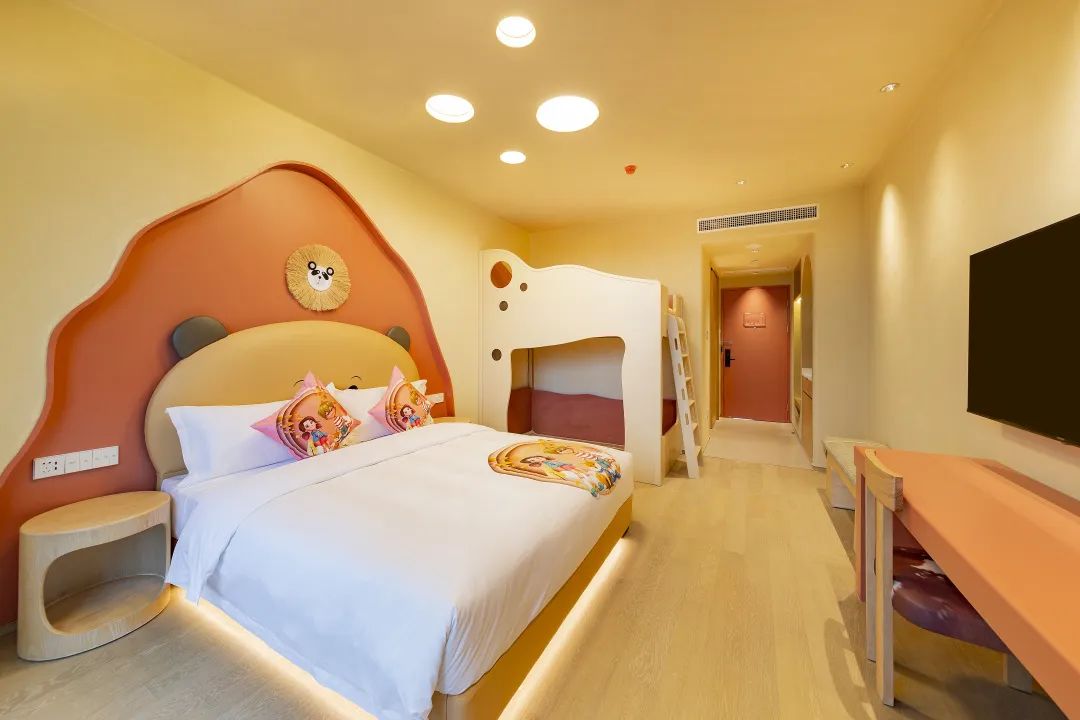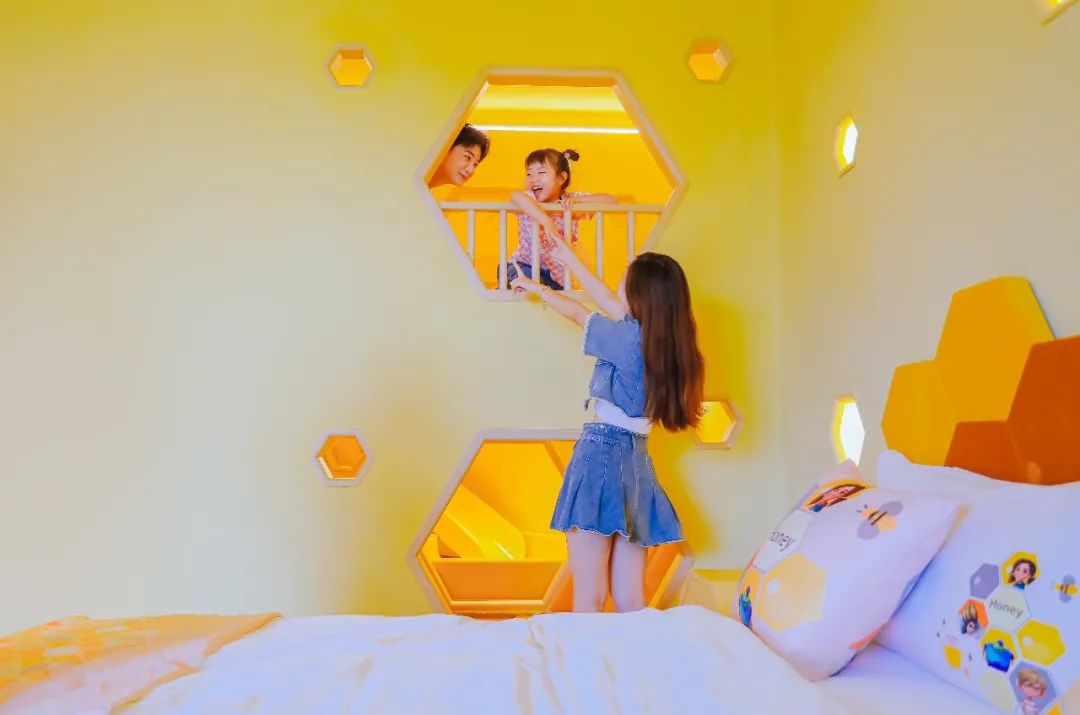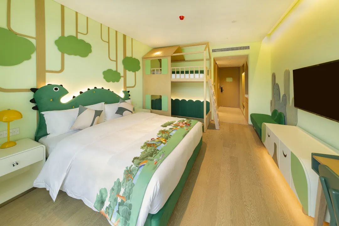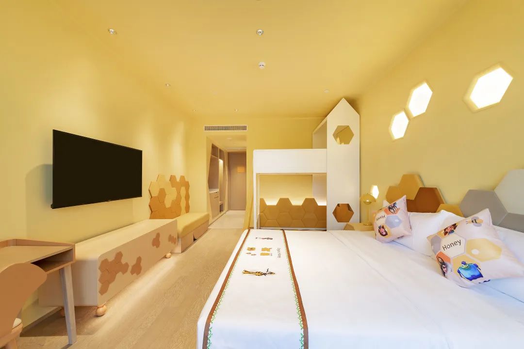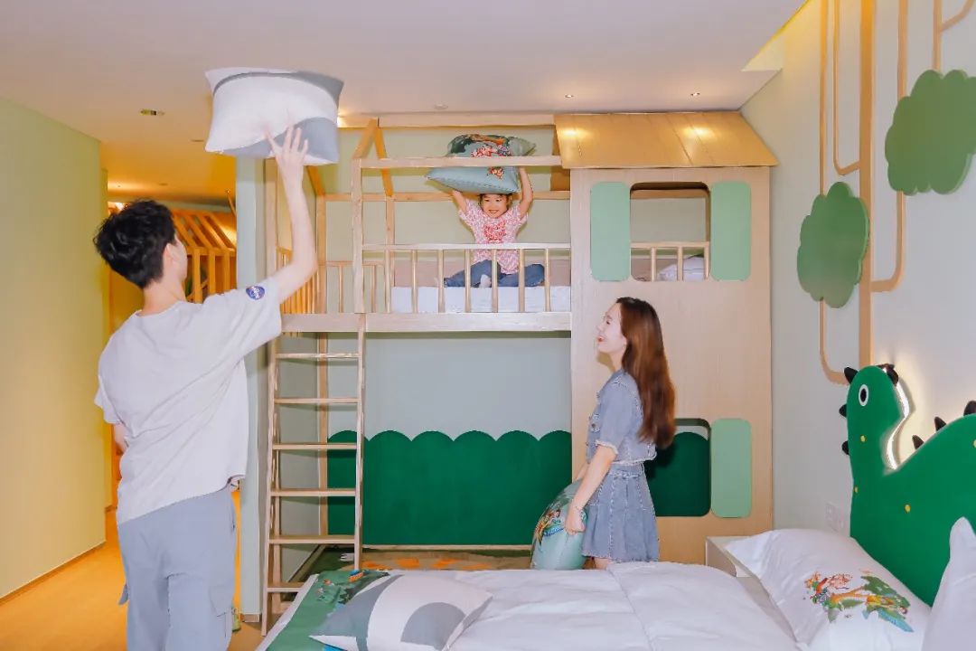 奇趣童年酒店紧扣奇趣童年亲子乐园“奇趣童年奇遇记”原创IP故事,共设149间客房及套房,以绿野仙踪、甜蜜蜂巢、溶洞探险为灵感,创新打造充满奇幻和童趣色彩的丛林秘境、蜂之部落、洞穴探险三大沉浸式主题客房,并配套三大儿童主题玩耍区,为亲子家庭开辟一个童真、冒险、创想的专属空间。