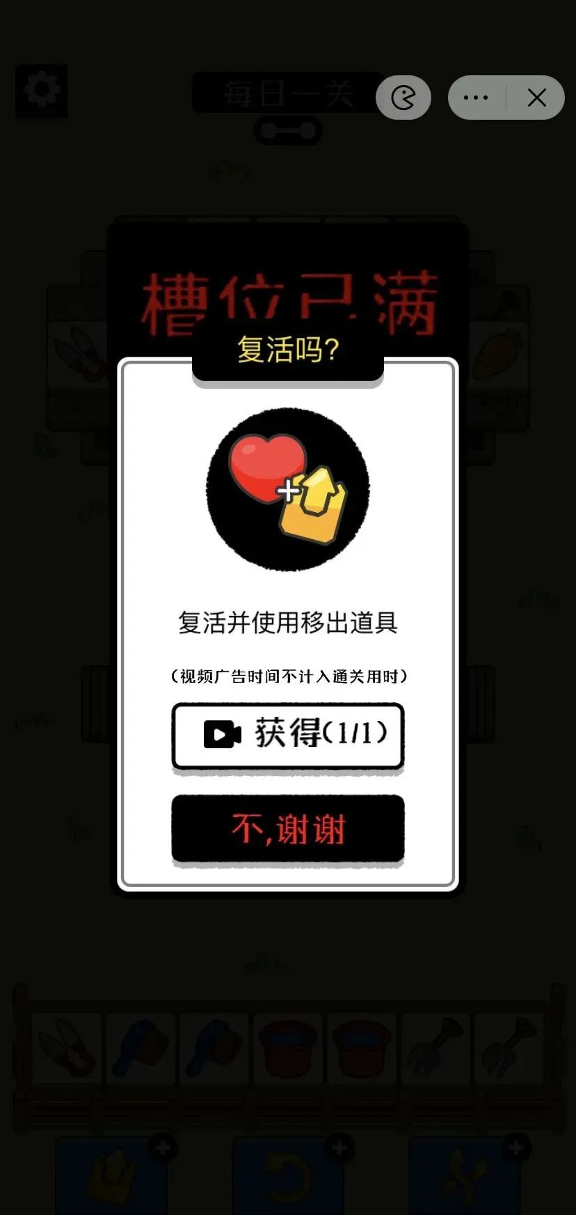 最终,广告流量才是目的。先用简单的第一关“把羊骗进来杀”,再用“只差一点就成功了”的第二关吊着“驴”去“屡败屡战”。游戏过程中,明明胜利在望,却陷入僵局,那就看广告换取小道具或者复活的机会吧,30秒的广告早已经准备好了。