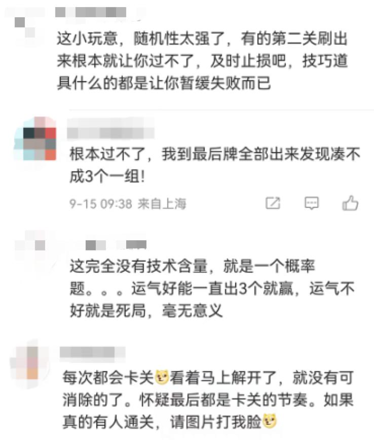 部分玩家将“过不去的第2关”归咎于游戏难度。但一些资深玩家和行业人士分析,“羊了个羊”并没有烧脑的复杂度,出现的牌型更像是“纯随机”,比起网上分享的“攻略”、“技巧”,运气和概率才是通关的核心要素。