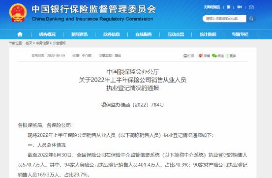 根据通报,截至2022年6月30日,全国保险公司在保险中介监管信息系统(以下简称中介系统)执业登记的销售人员570.7万人。
