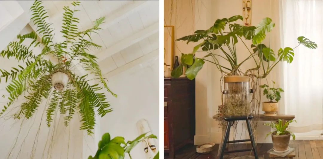 靠近阳台的角落,因为层高足够,从空中吊下来垂感好、向四周散开的蕨类植物,地面的龟背竹也是气根植物,茂盛的气根垂下来,组合起来,就像在热带雨林一样。