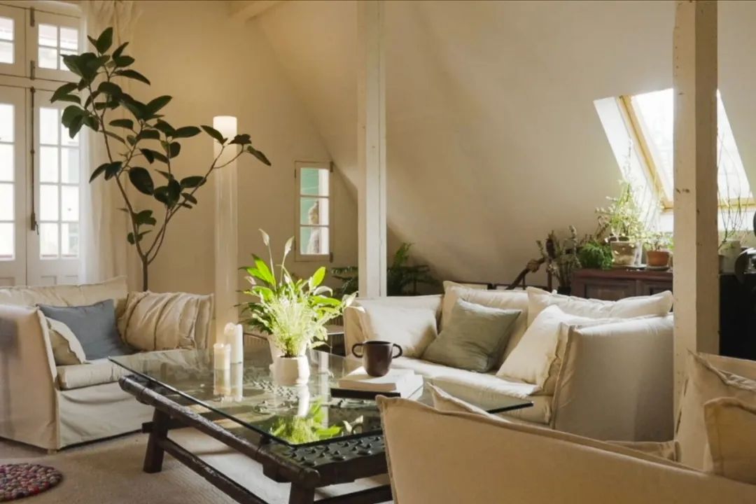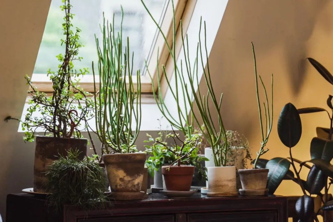 客厅斜屋顶有一个小天窗,我们则布置了适合直晒的线型的多肉,它们再茂盛,也不会堵住采光,小小一桌聚在那里,也有它们的气质。
