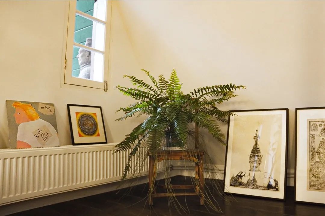 家里斜角、边角的地方比较多,又不方便人站立,我们就顺势摆了一些旧凳子当架子,和画作、绿植组合,形成一种独特的氛围。