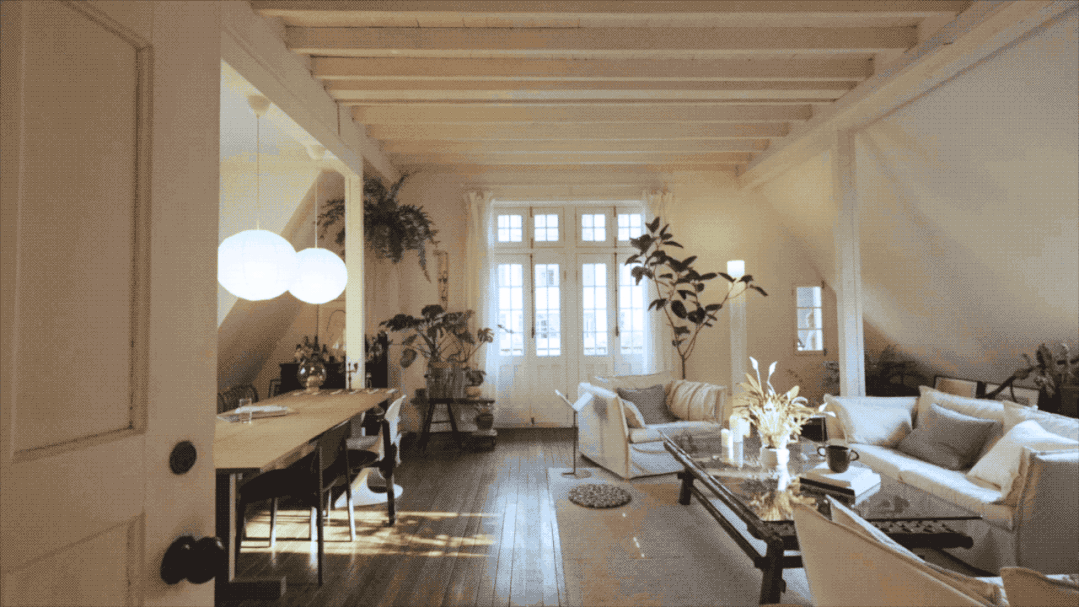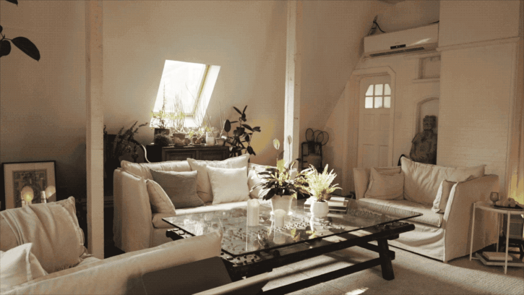 我们就化零为整,在客厅里布置了各种大小不同的灯,一盏大的落地灯,负责沙发区域的照明。餐桌上沿用了本来的电路,布置了宜家的吊灯,斜屋顶的角落,摆了绿植和画作的地方,就放小地灯,光向上打,像是画廊里的小射灯。