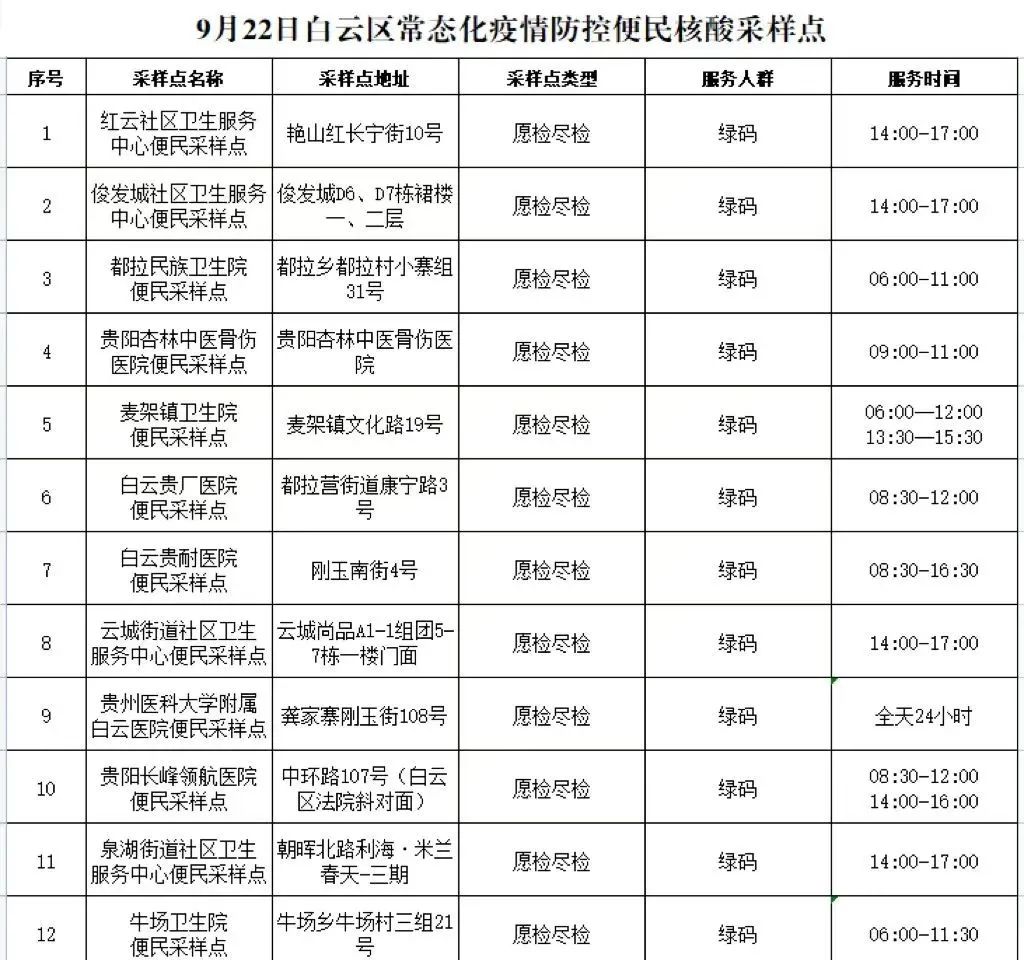 (二)便民核酸采样点:为配合做好9月22日区域人口核酸检测,白云区将部分便民核酸采样点服务时间进行了调整,请各位市民提前做好规划(具体地址及时间见附件)。