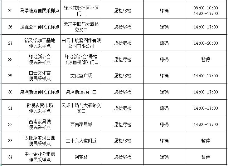全区除上述核酸检测区域外的便民核酸采样点不变,不参与区域核酸检测的其他市民群众可关注“爽爽贵阳 美美观山湖”“观观好汇玩”公众号或打开“观山湖区核酸采样点小程序”,查询核酸采样点位、服务状态及服务时间等,就近采样。