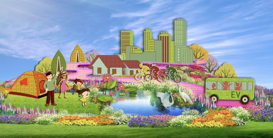 长安大厦布置“绿色发展”花坛,花坛顶高8.5米,以祖国的锦绣河山为场景,体现了生态优先、绿色发展的美好景象,寓意绿水青山就是金山银山。