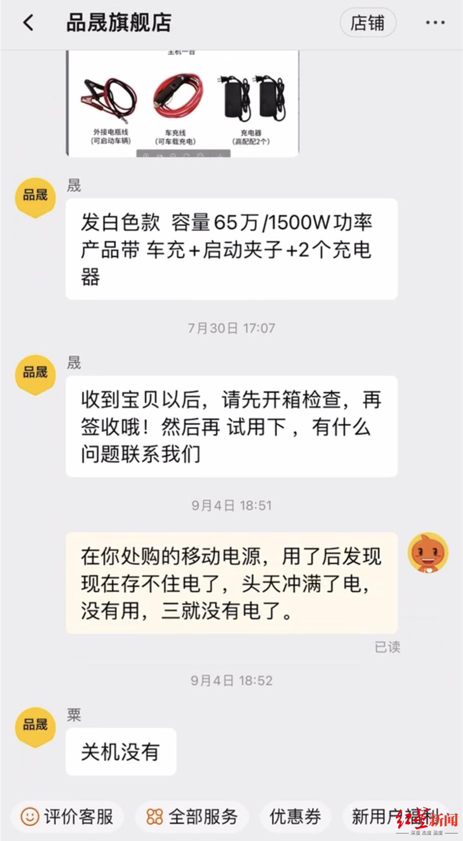 聊天截图显示,9月4日,时女士的父亲联系品晟旗舰店客服,“在你处购买的移动电源,用了后发现现在存不住电了,头天充满了电,没有用,三(天)就没电了。”客服询问是否有关机,时女士的父亲表示“关机了”,客服让其联系售后。