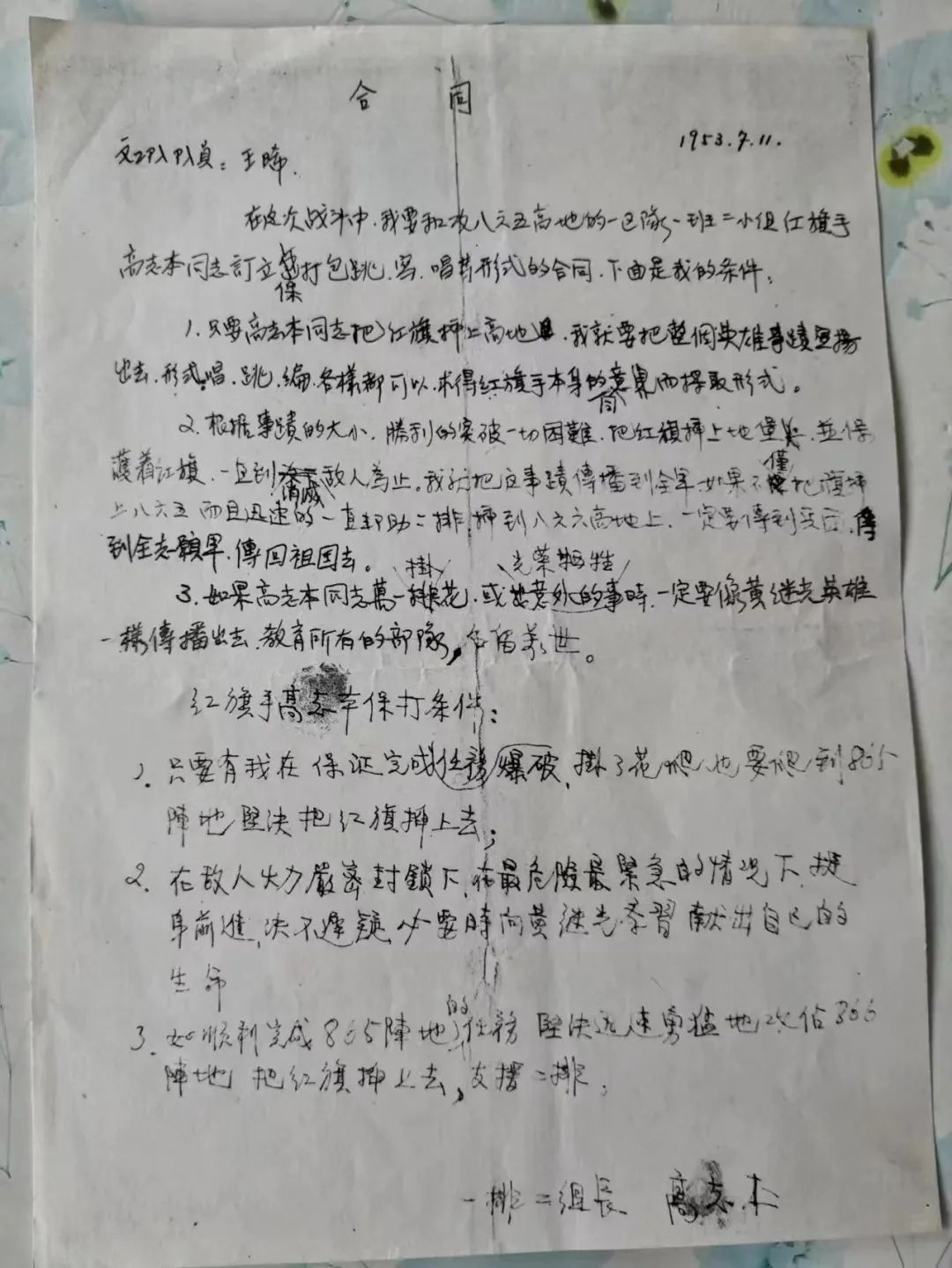 宋光华提供的历史珍贵资料“合同”中,文工团战士王晞与攻八六五高低的一区队一班二小组红旗手高志本约定,“只要高志本同志把红旗插上高地,我就要把整个英雄事迹宣扬出去……如果高志本同志万一挂花,或光荣牺牲时,一定要像黄继光英雄一样传播出去,教育所有的部队,名留于世。”这纸烽火“合同”谈的不是利益交换,而是一个人的生死,一支部队的荣光,一个民族的命运。由此也让“90后”文艺人懂得,文工团背负的,不只是在前线鼓舞士气,力所能及救助伤员、保证后勤的任务,更是用文艺作品让英雄与英雄精神永远长留人们心中的深重使命。