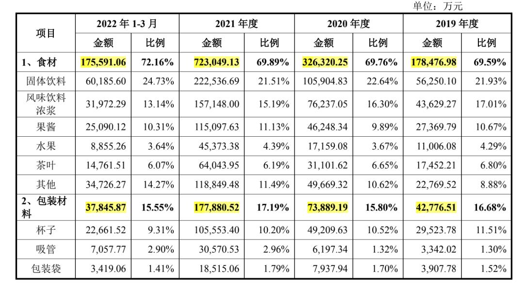 来源:蜜雪冰城招股书蜜雪冰城的主要营收也来源于向加盟商销售包括食材、设备等在内的系列产品。2019年至2021年,仅食材这一项,蜜雪冰城向加盟商收取的费用分别为17亿、32亿和72亿,占营收比基本为近70%。