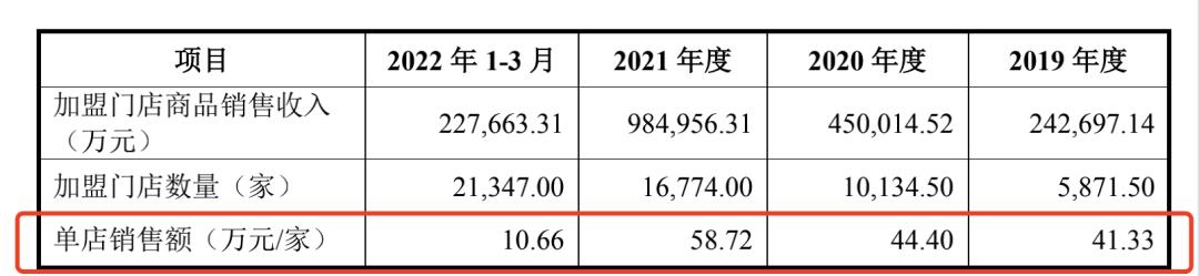 不过,从招股书来看,加盟商的单店销售额目前还是持续增长态势。2019年-2021年,单店销售额41.33万元、44.4万元、58.72万元。