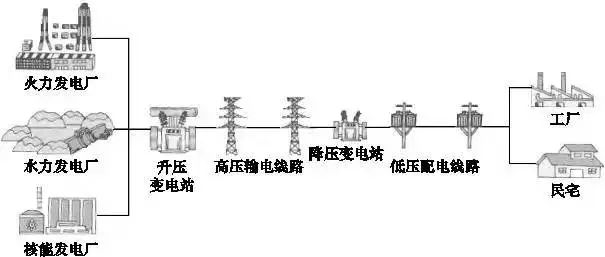 电能从生产到使用要经历多个环节以及大量复杂设备。发电厂发出的电通常是通过升压变电站、高压架空输电线路、降压变电站、输电线路到达用户。从专业角度讲,电能的生产、传输、分配、使用就构成了电力系统,包括发电、输变电、配电和用电四个环节。就具体而言,发电厂发出的电能(发电环节)经升压变电站的变电器升高电压后,送入输电线路,输电线路将电能输送到较远的用电地区(输变电环节),用电地区变电站的变压器将电压降低后,送入配电线路(配电环节),最后电能通过配电线路送到城市、郊区、乡镇和农村,并进一步分配和工业、农业、商业、居民以及特殊需要的用电部门(用电环节)。