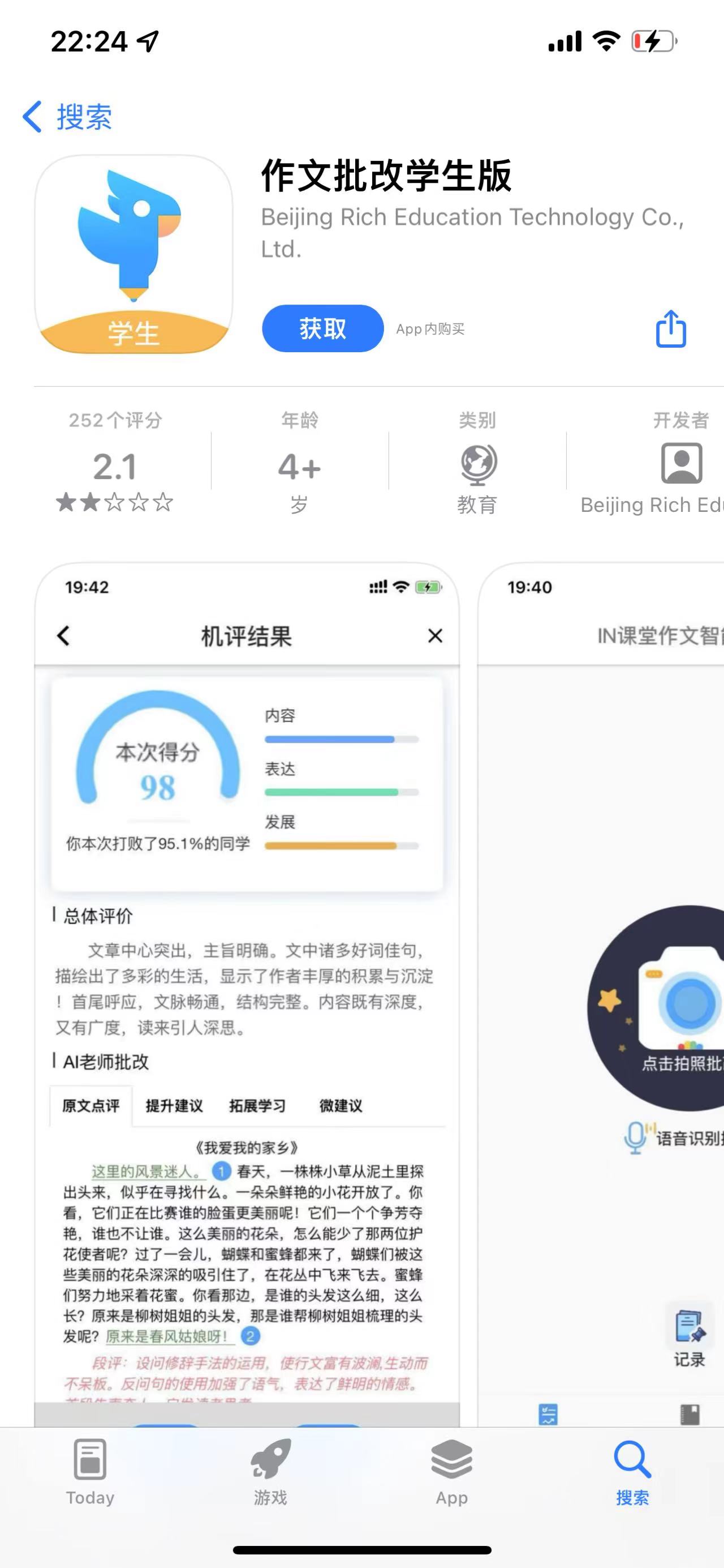 “IN课堂”作文批改学生版在iOS平台的介绍页面