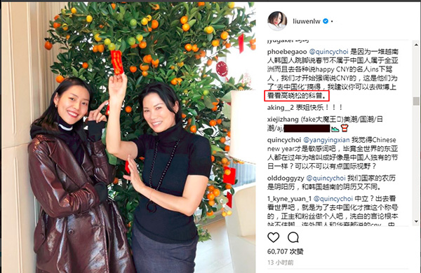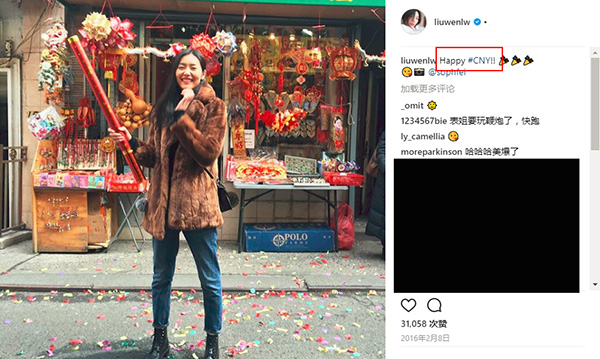 刘雯除了“错误”地使用了“农历新年”外,还有一项问题在于她此前发的都是祝福大家“中国新年”快乐,成了明知故犯的罪过。