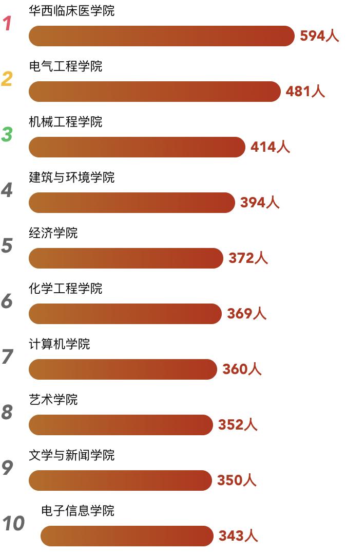 今年的本科新生录取人数最多的前五个学院依次是:华西临床医学院(594人)、电气工程学院(481人)、机械工程学院(414人)、建筑与环境学院(394人)、经济学院(372人)。祝不同学院、不同专业的每个新同学都能够在接下来的大学生活中学有所成!