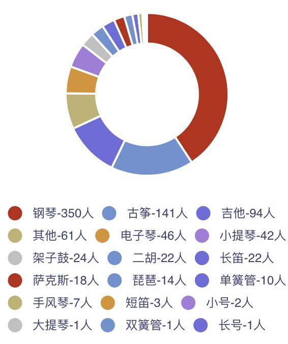 乐器类特长分布2022级本科新生中,擅长乐器类的最多,占新生总人数的一半。其中擅长人数最多的三类乐器依次为钢琴(350人)、古筝(141人)、吉他(94人)。