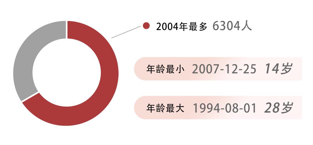 去年新生中年龄最小只有15岁,今年又有突破,新生最小年龄14岁,出生于2007年。新生中,年龄最大28岁。同年同月同日生的萌新们