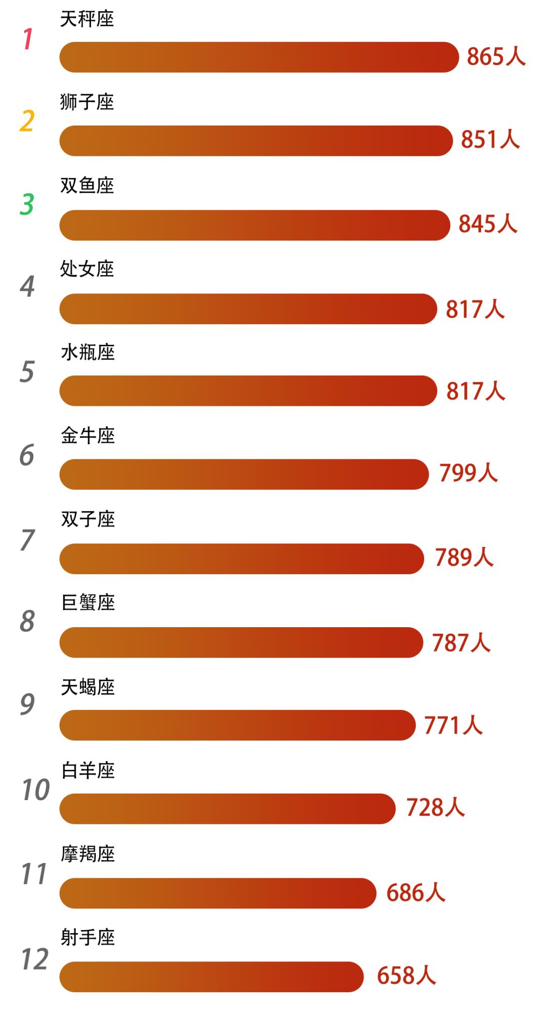2022级本科新生中,同一星座人数最多的前五分别为:天秤座(865人)、狮子座(851人)、双鱼座(845人)、处女座与水瓶座并列第四(817人)。祝2022级的新生们