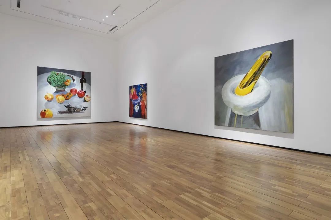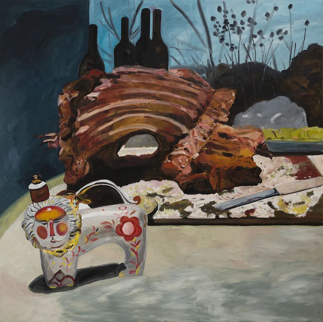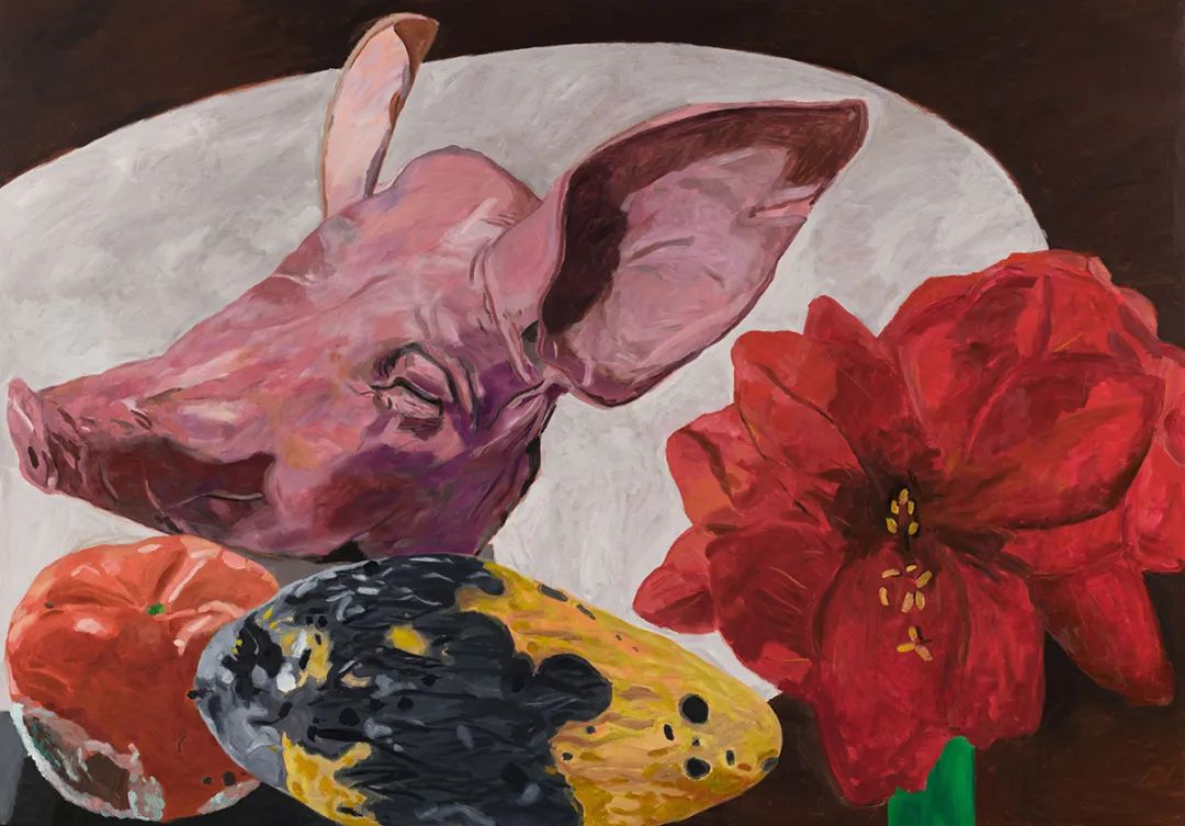 开幕式上嘉宾合影,摄影:shaunley据策展人鲁明军介绍,展览由三组作品穿插而成:第一组是静物,第二组是艺术家的自画像,第三组是混合了不同题材新旧作品的“派对”。静物大多取材自工作室、厨房,赵刚的处理并无定法,有时很古典,有时候则很现代,但有一点是一致的,即大部分静物被他刻意放大至数倍乃至数十倍,其尺度远远超出我们的经验。放大并不是为了凸显物和画面的细节,而是为了赋予这些日常之物(包括果蔬、肉、排骨、猪头、酒具、花瓶、烛台等)以神圣的位置,或者说,是为了拉开其与我们之间的距离。显然,有了这样的尺度和距离,我们目光所及的不再是熟悉的身边之物,而仿佛是我们自己处境和命运的镜像。绘画也不再是一个欣赏的对象,而是现实本身。与之对应的是一组艺术家的自画像。画中人物的大小与他本人相当,图像底本有的是虚构的,有的来自旧照片,透过画中人物的服饰,可以看出这里含括了(资本家)绅士、流浪者等多个不同的身份。延续了以往他关于自我身份的追寻和探问,此处他虽然身着不同身份的服饰并摆出相应的姿势,但不变的是他已然老去的面孔和身型。和静物画一样,毋宁说赵刚在这里是将他所描绘的诸种身份(包括作为艺术家的自己)视为同样正在朽坏的客观之物——当然,也许他是想以绘画的方式留给他们最后一丝尊严。第三组“派对” 混合了历史、地景、征服以及爱欲等多个主题,更像是前面两组作品的背面或注脚。