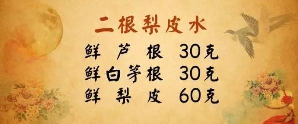 【做法】鲜芦根30克、鲜白茅根30克,共同放入锅中,加水后用大火烧开,小火煎煮10分钟,随后再加入梨皮60克泡水。