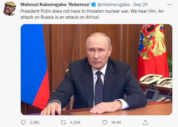 凯内鲁加巴上周六(24日)在推特上写道:“普京总统不需要以核战争相威胁。我们能听到他所说的。对俄罗斯的攻击就是对非洲的攻击!”