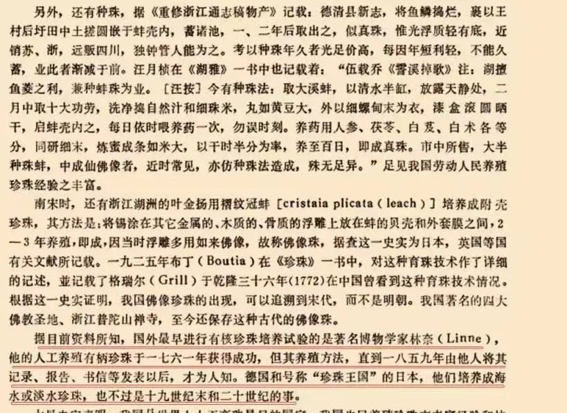 ▲1994年《珍珠史话》记载了叶金扬培育附壳珍珠的方法和林奈的珍珠培育试验