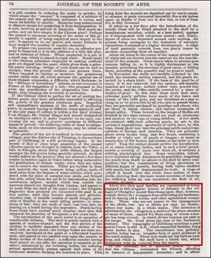 ▲瑞典科学家格瑞尔除了格瑞尔外,19世纪的旅行者也相继将佛像珍珠及其养殖方法带到欧洲。当时的旅行者描述了他们在中国所见的珍珠生成方法,1853年美国的麦嘉湖博士在《中国的珍珠及珍珠制造》一文中详细介绍了他在中国钟管和十字港所见到的人工珍珠养殖情况,并对叶金扬附壳佛像珍珠养殖的方法及规模进行了初步探究。1867年,查尔斯·狄更斯在其创办的期刊《一年四季》中详细描述了中国附壳佛像珍珠形成的过程:把由青铜制成的中国小型佛像放入大型珍珠蚌体,蚌体分泌珍珠质层将佛像覆盖。这一描述说明,此时的欧洲人对于中国附壳珍珠的形成方法已经相当了解。