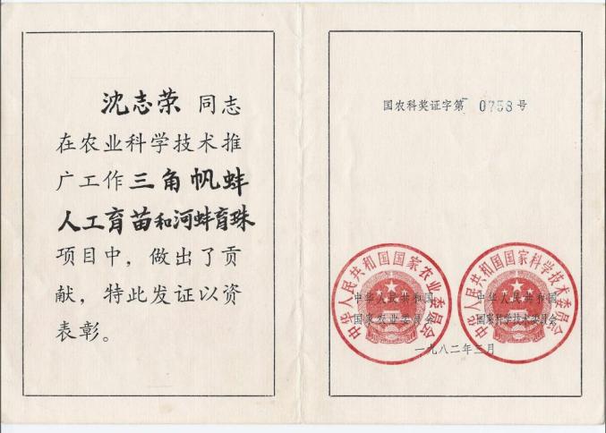 ▲上个世纪80年代,沈志荣成功研究出的三角帆蚌人工繁殖技术荣获国家农委、国家科委颁发的农业科技推广奖并在全国广泛推广1975年,江苏吴县黄埭首次发生“蚌瘟病”,之后该病陆续在全国主要珍珠养殖区域大面积爆发,沈志荣于1986年担任了农业部下达的“防治三角帆蚌蚌瘟病课题”课题组组长,在与相关科研院所的共同努力下,通过对该病原体的分离提纯及其生物学特性的初步研究,沈志荣首次提出了蚌瘟病的致病原为病毒的观点,并初步确定了病毒的基本特性。
