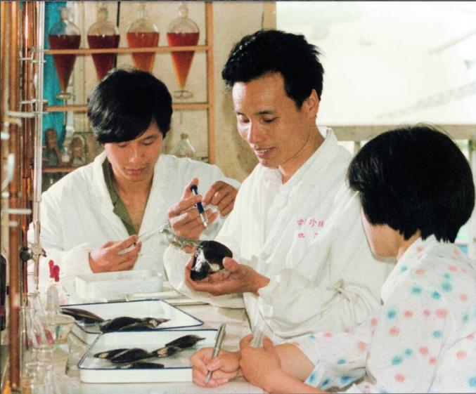 ▲中国海水珍珠养殖研究专家熊大仁工作照1967年,在古代附壳珍珠常规化培育的发源地德清,沈志荣开始了对珍珠养殖技术的研究。沈志荣在熊大仁研究成果的基础上,进一步对送片工具及植片部位进行改进,使珍珠蚌小片插种过程更易操作,珍珠生产的质量更易掌控。当时常规淡水珍珠的培育采用的是自然产蚌类,但由于过度捕捞,蚌类资源逐渐稀缺。珍珠的可持续发展受到了破坏。为解决蚌源受限的问题,1970年,沈志荣开始对三角帆蚌的人工繁育技术进行研究,经过5年的实验和探索,三角帆蚌人工繁育技术最终取得成功,有效地解决了育珠源不足,珍珠生产受限的问题,同时进一步扩大了珍珠养殖范围。提高珍珠质量技术和三角帆蚌人工繁育技术是我国现代珍珠培育技术进一步发展的表现。